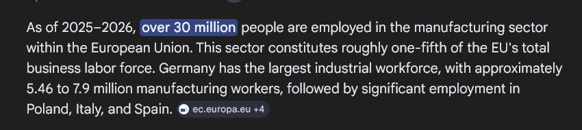>>533256617>>533256619>30 mln people work in factories across the entire continentand 30 mln people will continue to work in factories, even with the gigantic (and very desirable) population collapse. >still not even 1 jew can explain why anybody would want an infinite pop growthcringe.