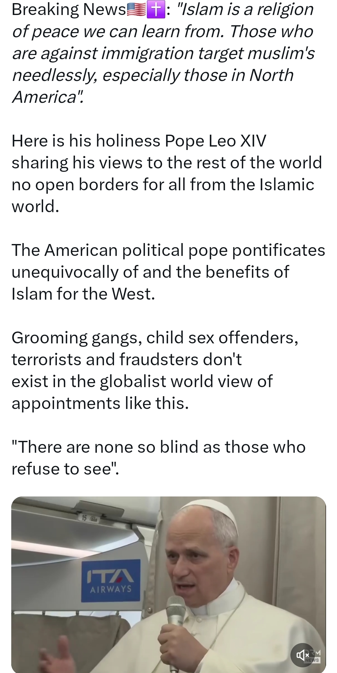 He says the West needs to be less afraid of Islamic immigration and have coexistence (in the west itself) with Muslims.He praises Lebanon as an example of peaceful coexistence between Muslims and Christians.https://x.com/i/status/2044331909392605508