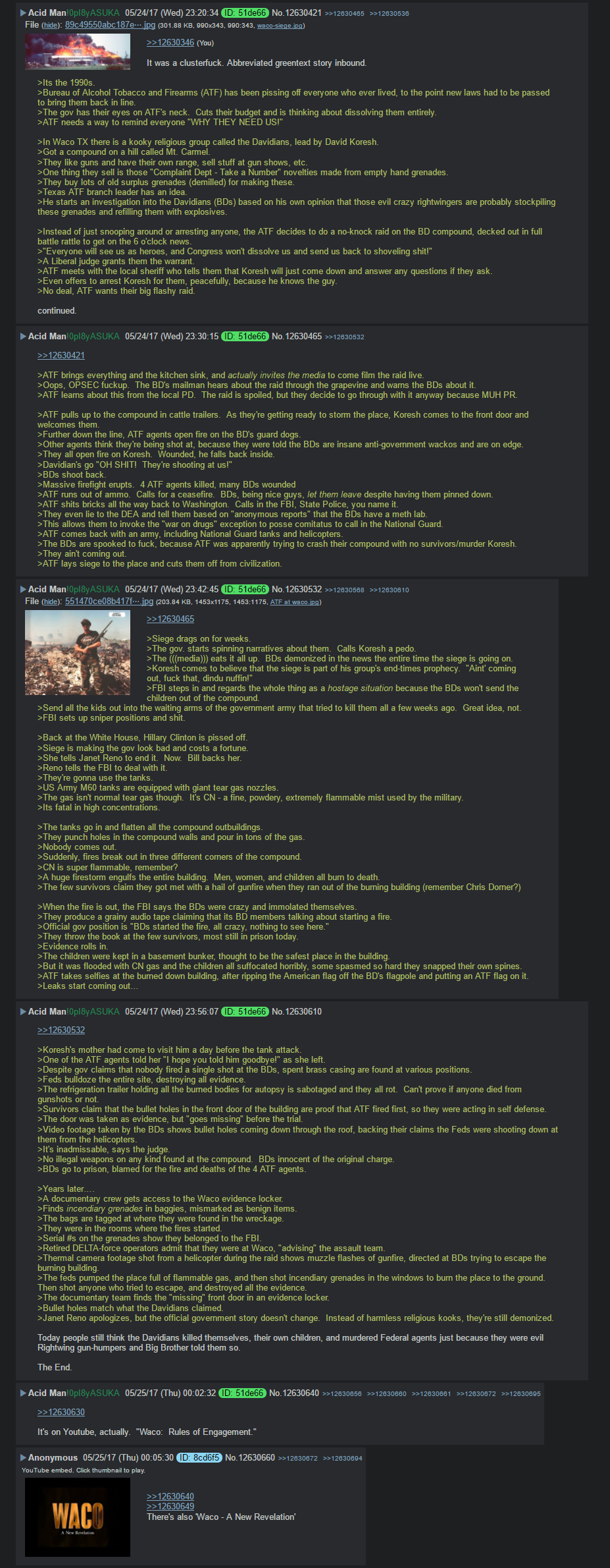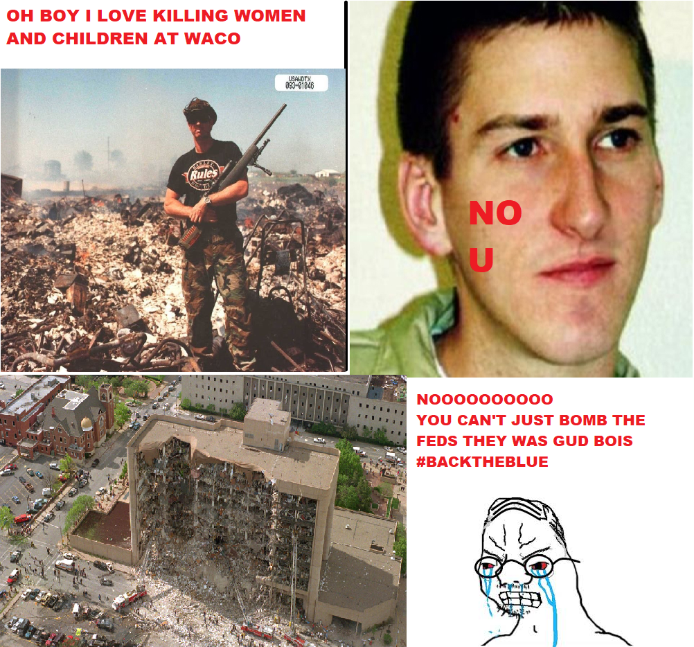 >>533280156I still have some pretty clear memory of the events. It was really a complete failure on the part of the government. > At Ruby Ridge, the government looked like idiots after shooting the child and dog of someone they could have quietly arrested days/weeks before, but instead chose to put on a show raid> Following Ruby Ridge, the people at Waco got super paranoid. Meanwhile, the government looking stupid from RR, decided to make a show of how professional/tough they were at Waco, and screwed that up too.> Following Waco, one of the random people watching the whole thing from outside the perimeter of the compound goes nuts himself, and blows up a federal building in Oklahoma city.In retrospect, everyone instantly saw the connection between event 1, 2 and 3; but it was in retrospect, which means too late to go back and fix their mistakes