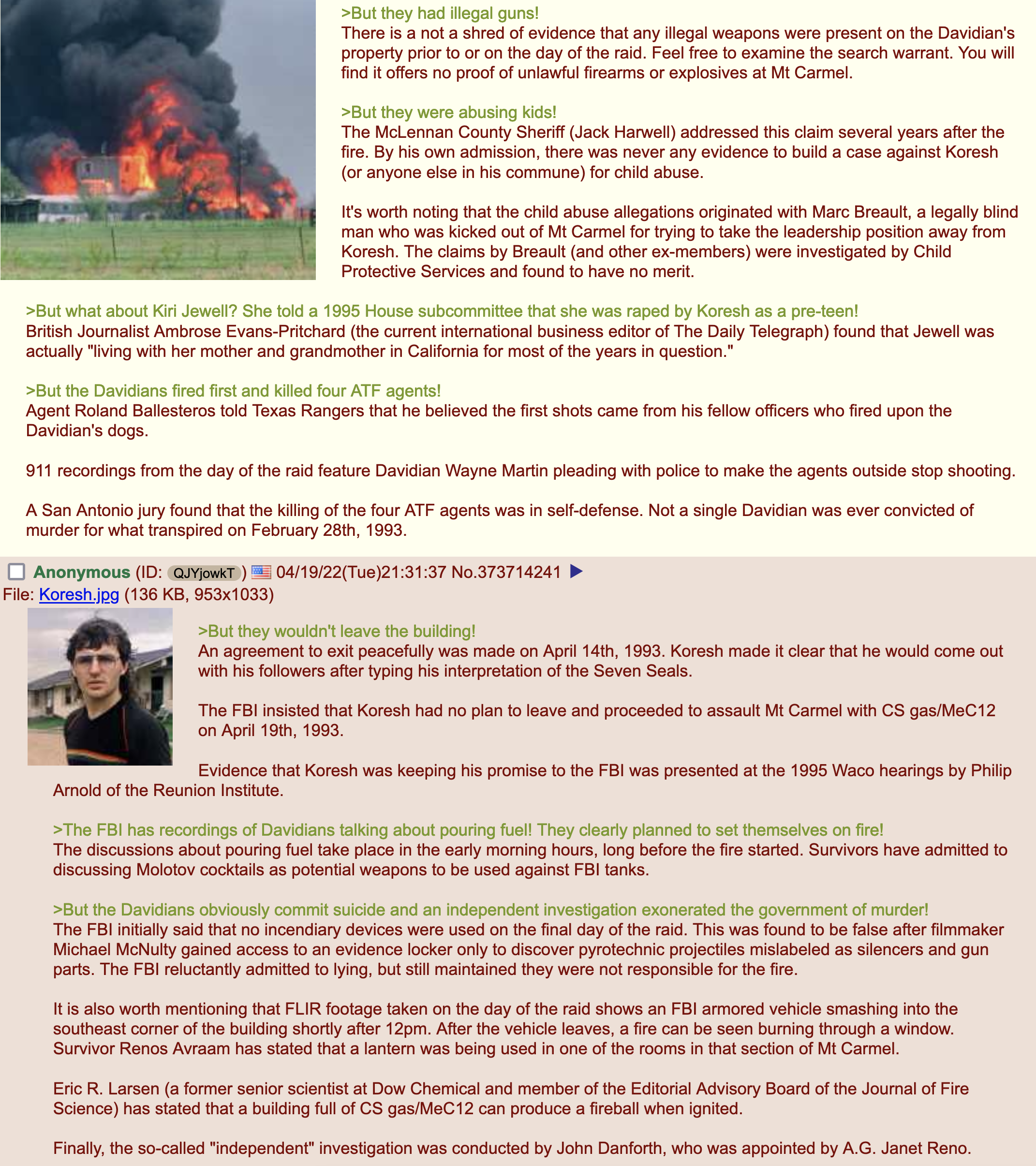>>533258758That fact? Which ones got disproved more lmao. Feds made that shit up to villainize the cult. He’s a fucking nut. BUT, is been proven many times that both of those claims are false. Multiple survivors have denounced that. The feds needing a “good” win after the slaughter at Ruby Ridge. So Davey boy became the boogey man. They manufacture those crimes to somehow make murdering them ok. People hate bringing up how many children died. Muddles it up
