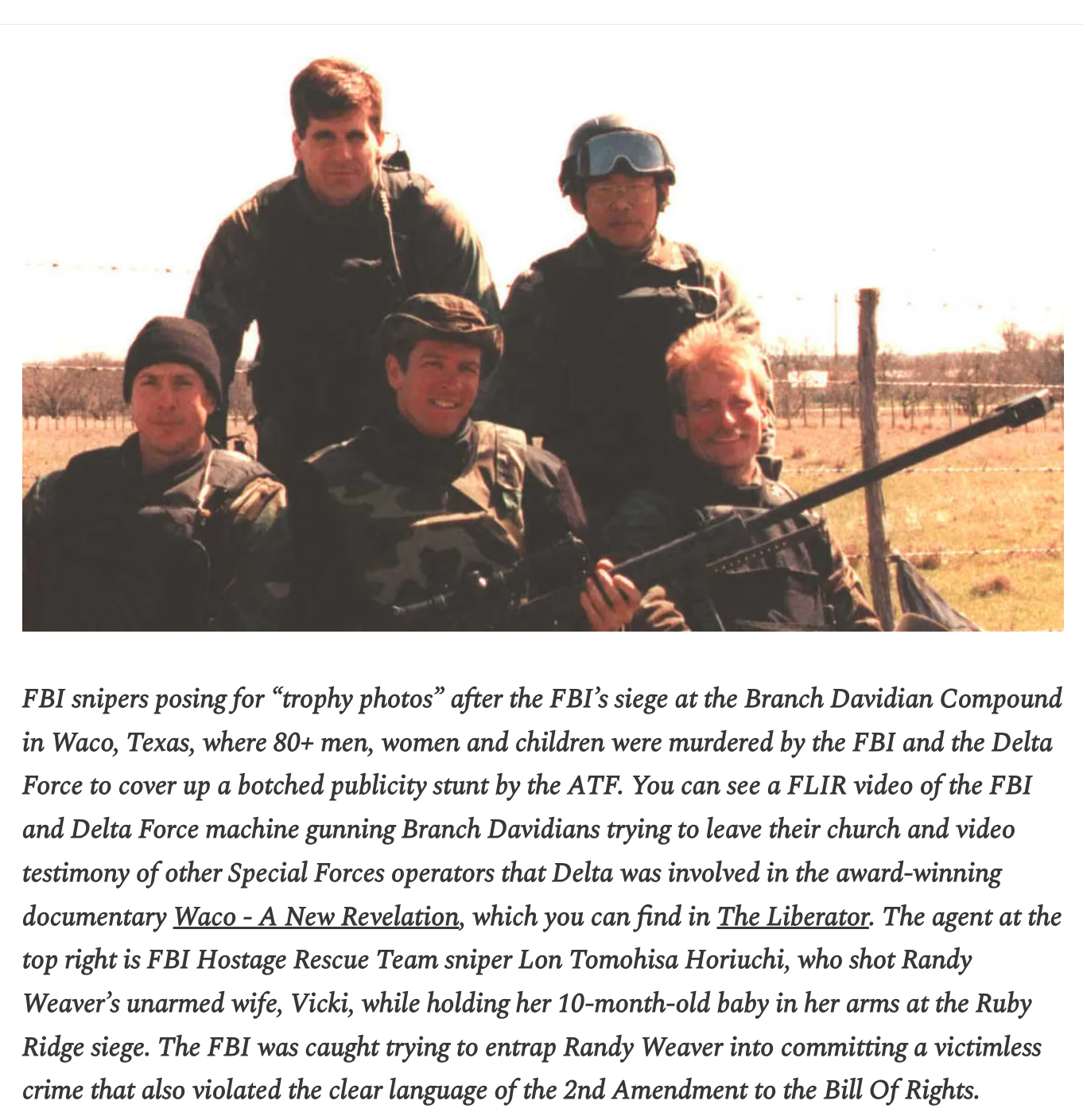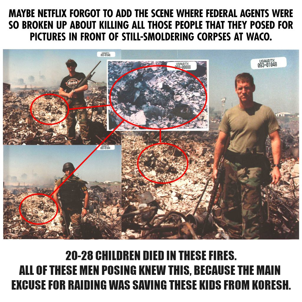 >>533258049>what was Waco aboutDavid Koresh was a weirdo cult leader who thought he was the messiah and the government was evil (he was half right). Clinton's ATF wanted a big feel good publicity story so instead of just arresting Koresh easily when he drove into town (which he did regularly without an escort) they decided they'd bring in a huge force and raid his compound. Predictably the anti government cultists fought back giving the ATF the big news story they wanted. Then the ATF proceeded to completely fuck everything up. They sent in an assault team that got their asses handed to them on live TV. Then they sent in an assault vehicle to punch a hole in the side of the building and dump flash bangs and tear gas inside. This proceeded to light the building on fire. Once the building was on fire the ATF continued to fire on people trying to flee as the surviving cultists testified, the ATF said the cultists started the fire and stayed inside to die. However the front door of the building was lost so there was no evidence and the ATF was excused. Years later the door was found after the trial and it was riddled with bullet holes from the outside proving the ATF killed everyone. Here are the pictures the ATF took posing with their guns over the smoldering remains of 86 people including 28 children.