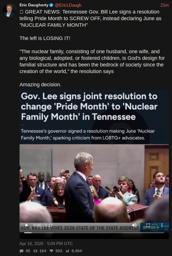 >Tennessee Gov. Lee signs resolution to change 'Pride Month' to 'Nuclear Family Month'.Troon melties incoming...