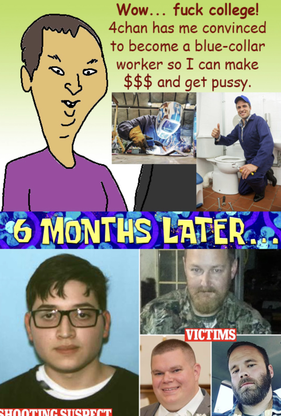 >>533281334>Okay so we all make a change to become more like you. We then become more smart/wealthy/useful.See>>533276910A college degree can make you rich. You just have to be the best. I have a friend who studied Chemical Engineering, and he got a job with Chevron. Started at like $110k day 1.But it’s competitive.More realistic, get your A&P. Start working on airplanes. Once you’re fully qualified, you can be at $80k to $100k pretty fast. The hard part is finding a place that won’t make you work nights for 10 years.Or be a Machinists Mate in oil and gas. The job is dirty, long hours, hot sun, constant travel, but you’ll make good money. Is it worth it? Up to you.Or you can keep searching for the cozy, $500k coffee and email job that only exist for women and boomers. Oh well.