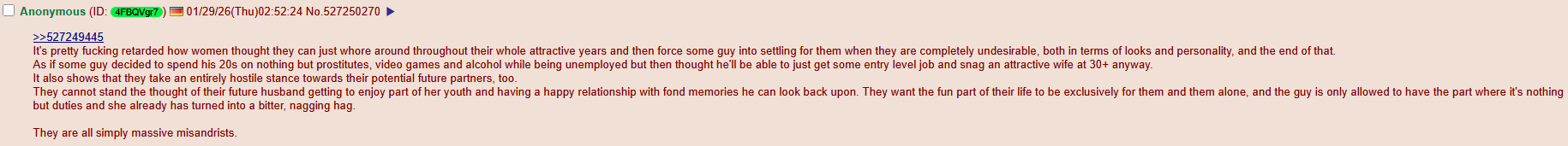 >>533284119you don't suppose it might be a reaction to decades of women being fat angry man hating feminists who murder their men's children in the womb and betray their own nations by letting in hordes of invaders and attack men in every single media outlet every single day do you?? no? not related at all?