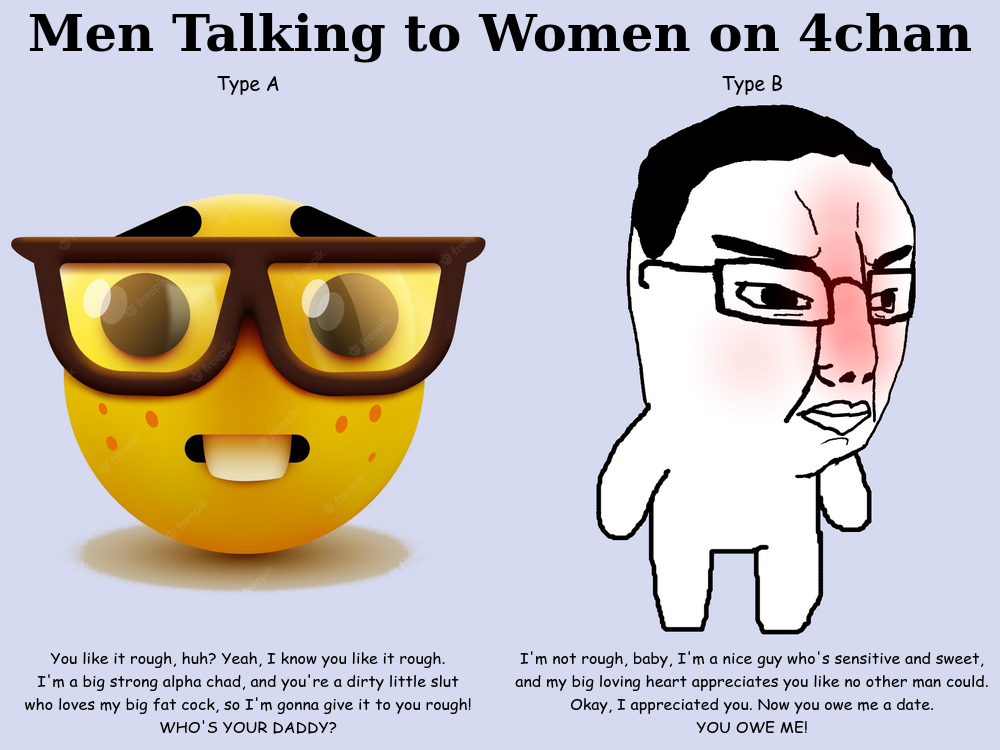 >>533284071You have to get to normal people to get to true ideas about men.Every undesirable geek is going to hate men right off the bat. I don't give a fuck about what some minority or weirdo woman thinks about me.