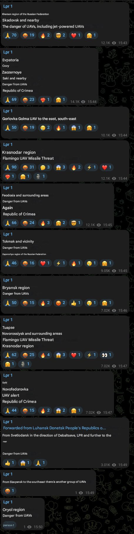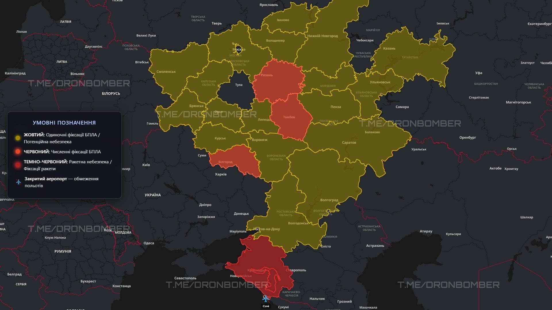 >It’s been a while since we’ve seen air raid sirens on this scale. Could it be that Madyar is back from vacation?>Drone Activity: Significant swarms of UAVs are being tracked across a massive corridor — from Kuban all the way to Tatarstan.>All information is based on Russian monitoring resources and local reports.