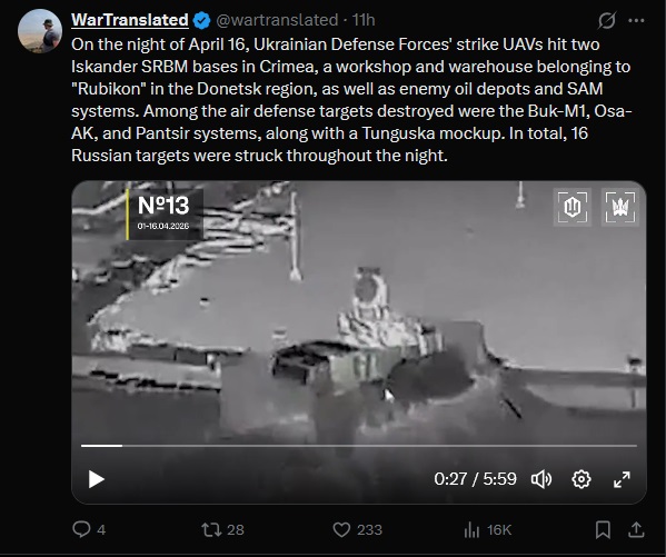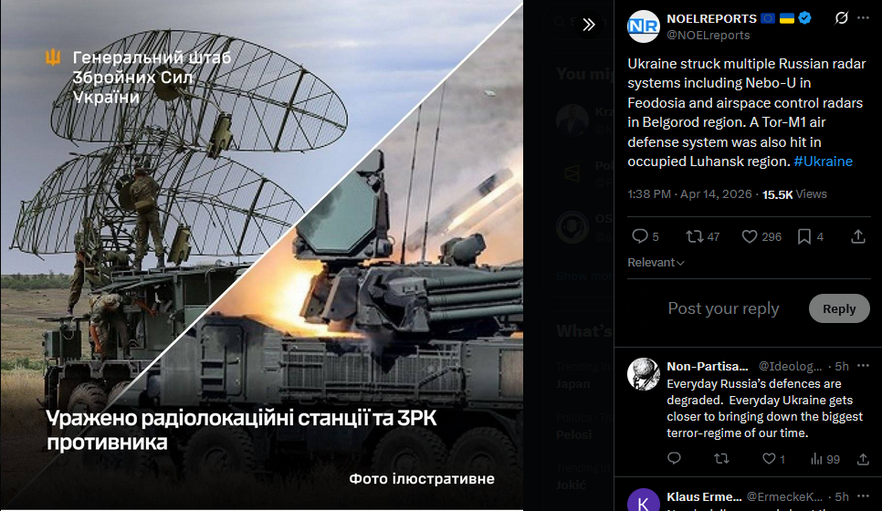 Ukraine struck multiple Russian radar systems including Nebo-U in Feodosia and airspace control radars in Belgorod region. A Tor-M1 air defense system was also hit in occupied Luhansk region. #Ukrainehttps://x.com/NOELreports/status/2044032665079148870?s=20>14th