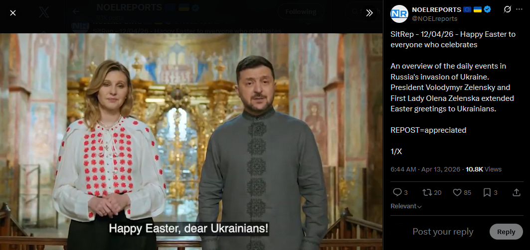 SitRep - 12/04/26 - Happy Easter to everyone who celebratesAn overview of the daily events in Russia's invasion of Ukraine. President Volodymyr Zelensky and First Lady Olena Zelenska extended Easter greetings to Ukrainians.https://x.com/NOELreports/status/2043565929204740164?s=20