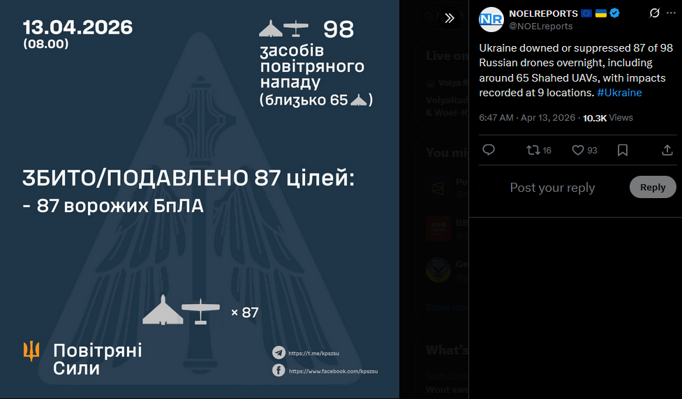 Ukraine downed or suppressed 87 of 98 Russian drones overnight, including around 65 Shahed UAVs, with impacts recorded at 9 locations. #Ukrainehttps://x.com/NOELreports/status/2043566729624711269?s=20>13th