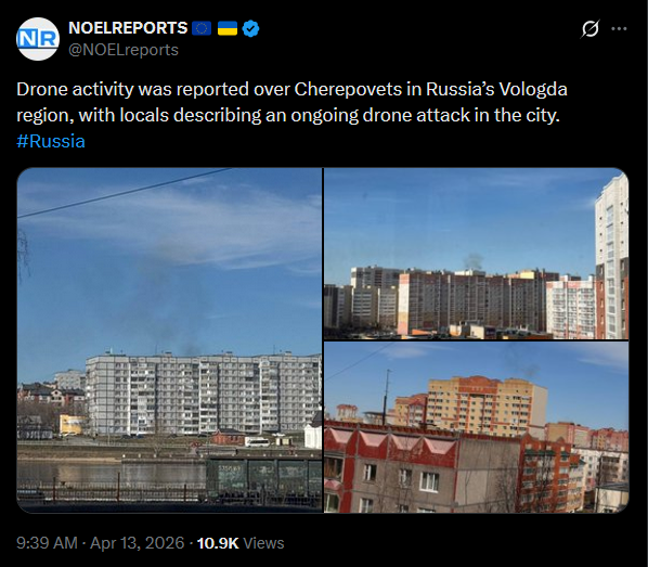 Drone activity was reported over Cherepovets in Russia’s Vologda region, with locals describing an ongoing drone attack in the city. #Russiahttps://x.com/NOELreports/status/2043609997297246241?s=20>13thpic 1https://files.catbox.moe/b147x1.jpgpic 2https://files.catbox.moe/ajfr7u.jpgpic 3https://files.catbox.moe/lztuy5.jpg