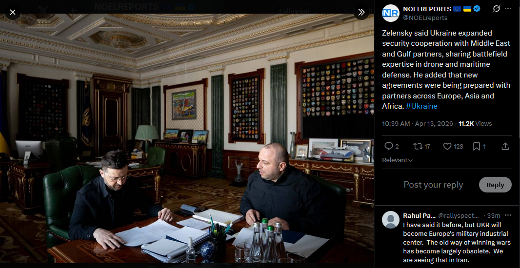 Zelensky said Ukraine expanded security cooperation with Middle East and Gulf partners, sharing battlefield expertise in drone and maritime defense. He added that new agreements were being prepared with partners across Europe, Asia and Africa. #Ukrainehttps://x.com/NOELreports/status/2043625179339731421?s=20>13th