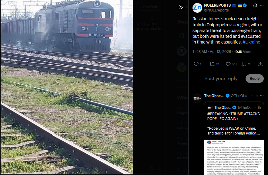 Russian forces struck near a freight train in Dnipropetrovsk region, with a separate threat to a passenger train, but both were halted and evacuated in time with no casualties. #Ukrainehttps://x.com/NOELreports/status/2043637389684249039?s=20>13th