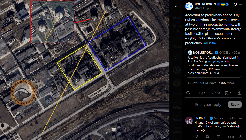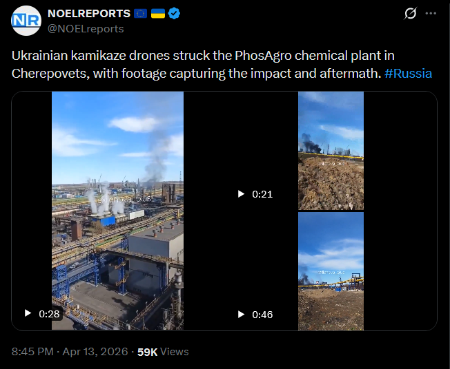A strike hit the Apatit chemical plant in Russia’s Vologda region, which produces materials used in explosives manufacturing. #Russiahttps://x.com/NOELreports/status/2043653904118739343?s=20>13thhttps://files.catbox.moe/hrm97a.mp4