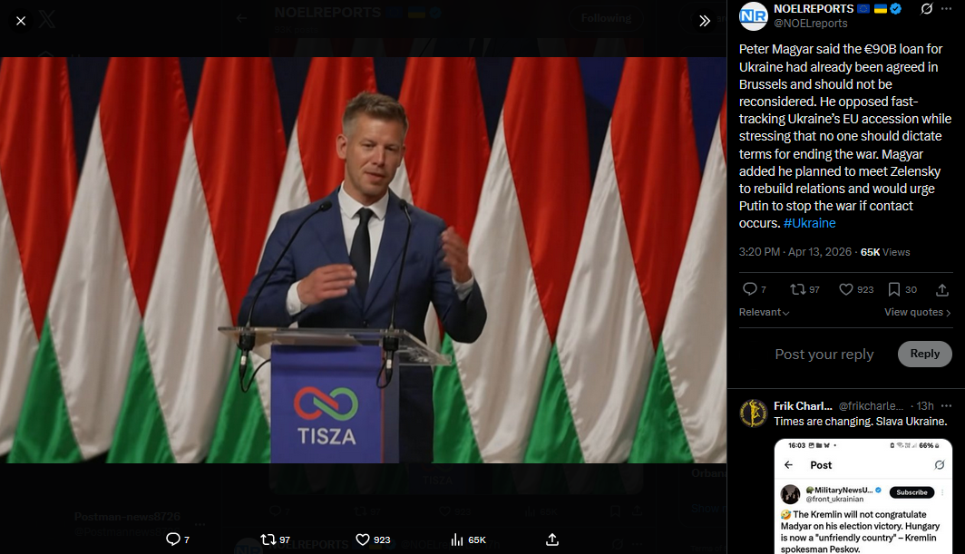 Peter Magyar said the €90B loan for Ukraine had already been agreed in Brussels and should not be reconsidered. He opposed fast-tracking Ukraine’s EU accession while stressing that no one should dictate terms for ending the war. Magyar added he planned to meet Zelensky to rebuild relations and would urge Putin to stop the war if contact occurs. #Ukrainehttps://x.com/NOELreports/status/2043695741600743552?s=20>13th