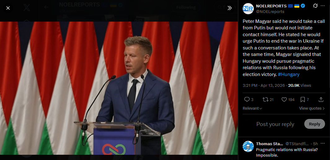 Peter Magyar said he would take a call from Putin but would not initiate contact himself. He stated he would urge Putin to end the war in Ukraine if such a conversation takes place. At the same time, Magyar signaled that Hungary would pursue pragmatic relations with Russia following his election victory. #Hungaryhttps://x.com/NOELreports/status/2043696158233542708?s=20>13th