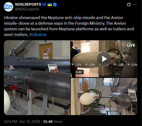 Ukraine showcased the Neptune anti-ship missile and the Areion missile-drone at a defense expo in the Foreign Ministry. The Areion system can be launched from Neptune platforms as well as trailers and semi-trailers. #Ukrainehttps://x.com/NOELreports/status/2043696858350907683?s=20>13thpic 1https://files.catbox.moe/e2zbu9.jpgpic 2https://files.catbox.moe/k7bkbz.jpgvideohttps://files.catbox.moe/ei3nig.mp4