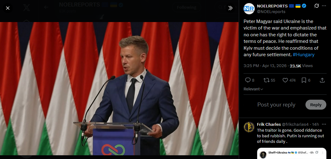 Peter Magyar said Ukraine is the victim of the war and emphasized that no one has the right to dictate the terms of peace. He reaffirmed that Kyiv must decide the conditions of any future settlement. #Hungaryhttps://x.com/NOELreports/status/2043697047165952136?s=20>13th
