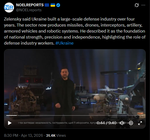 Zelensky said Ukraine built a large-scale defense industry over four years. The sector now produces missiles, drones, interceptors, artillery, armored vehicles and robotic systems. He described it as the foundation of national strength, precision and independence, highlighting the role of defense industry workers. #Ukrainehttps://x.com/NOELreports/status/2043773734297673755?s=20>13thhttps://files.catbox.moe/dxsm8b.mp4>a almost 10 minute video, not translated