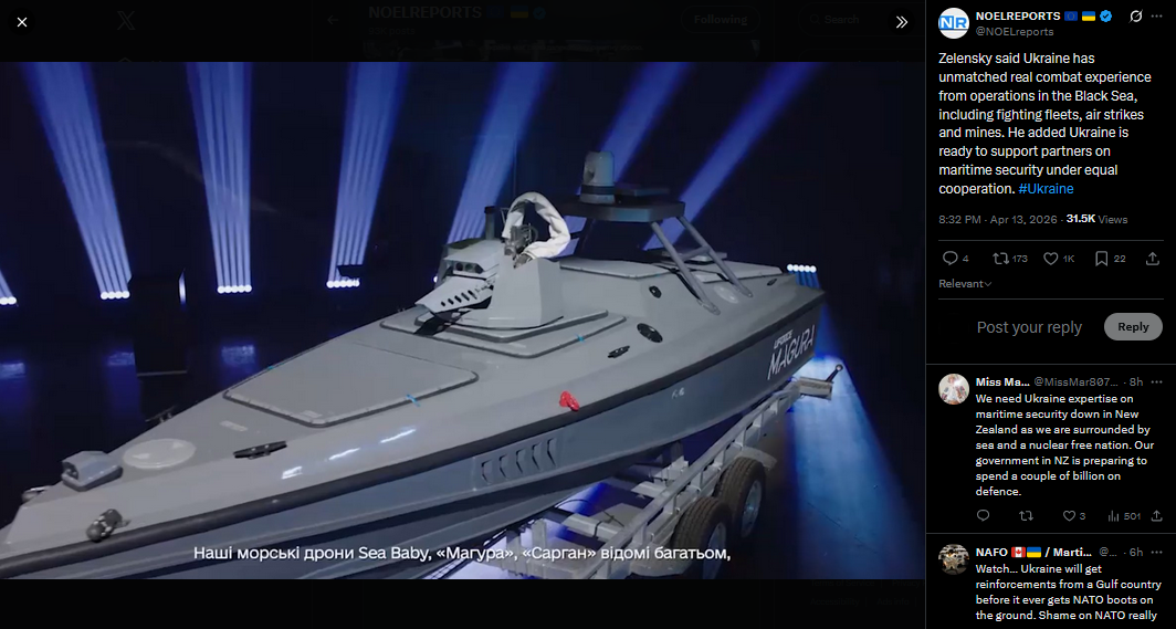 Zelensky said Ukraine has unmatched real combat experience from operations in the Black Sea, including fighting fleets, air strikes and mines. He added Ukraine is ready to support partners on maritime security under equal cooperation. #Ukrainehttps://x.com/NOELreports/status/2043774297521430978?s=20>13th