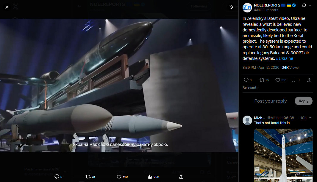 In Zelensky’s latest video, Ukraine revealed a what is believed new domestically developed surface-to-air missile, likely tied to the Koral project. The system is expected to operate at 30-50 km range and could replace legacy Buk and S-300PT air defense systems. #Ukrainehttps://x.com/NOELreports/status/2043776004569645480?s=20>13th