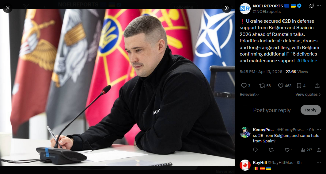 Ukraine secured €2B in defense support from Belgium and Spain in 2026 ahead of Ramstein talks. Priorities include air defense, drones and long-range artillery, with Belgium confirming additional F-16 deliveries and maintenance support. #Ukrainehttps://x.com/NOELreports/status/2043778323801608619?s=20>13th