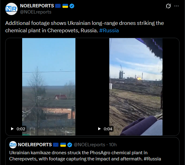 Ukrainian kamikaze drones struck the PhosAgro chemical plant in Cherepovets, with footage capturing the impact and aftermath. #Russiahttps://x.com/NOELreports/status/2043777618235797952?s=20>13thpic 1https://files.catbox.moe/z3qo0i.mp4pic 2https://files.catbox.moe/etbq0z.mp4pic 3https://files.catbox.moe/4btdq6.mp4