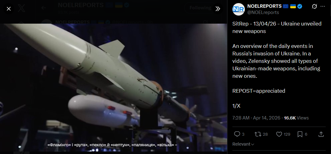 SitRep - 13/04/26 - Ukraine unveiled new weaponsAn overview of the daily events in Russia's invasion of Ukraine. In a video, Zelensky showed all types of Ukrainian-made weapons, including new ones.https://x.com/NOELreports/status/2043939372911735080?s=20