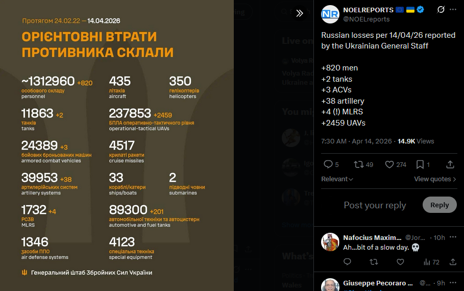 Russian losses per 14/04/26 reported by the Ukrainian General Staff+820 men+2 tanks+3 ACVs+38 artillery+4 (!) MLRS+2459 UAVshttps://x.com/NOELreports/status/2043939970159694044?s=20