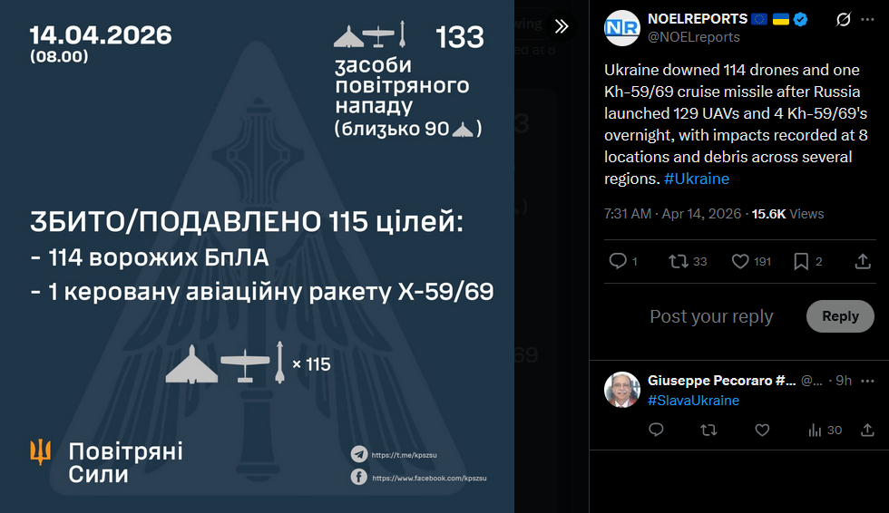 Ukraine downed 114 drones and one Kh-59/69 cruise missile after Russia launched 129 UAVs and 4 Kh-59/69's overnight, with impacts recorded at 8 locations and debris across several regions. #Ukrainehttps://x.com/NOELreports/status/2043940306026889282?s=20>14th