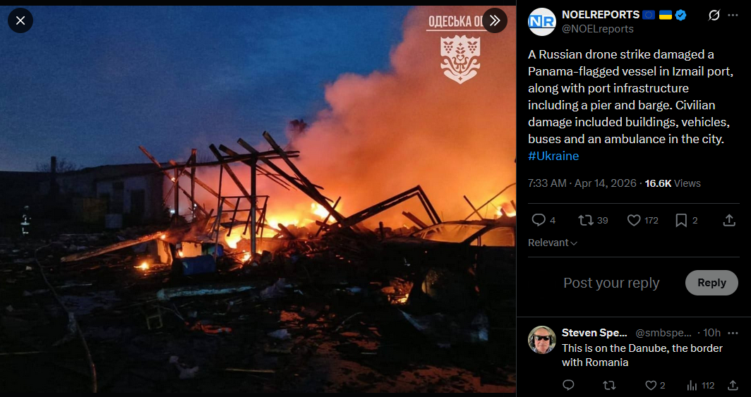 A Russian drone strike damaged a Panama-flagged vessel in Izmail port, along with port infrastructure including a pier and barge. Civilian damage included buildings, vehicles, buses and an ambulance in the city. #Ukrainehttps://x.com/NOELreports/status/2043940584319070343?s=20>14th
