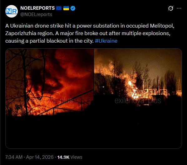 A Ukrainian drone strike hit a power substation in occupied Melitopol, Zaporizhzhia region. A major fire broke out after multiple explosions, causing a partial blackout in the city. #Ukrainehttps://x.com/NOELreports/status/2043940907167142238?s=20>13thpic 1https://files.catbox.moe/dz3enl.jpgpic 2https://files.catbox.moe/gd5amw.jpg