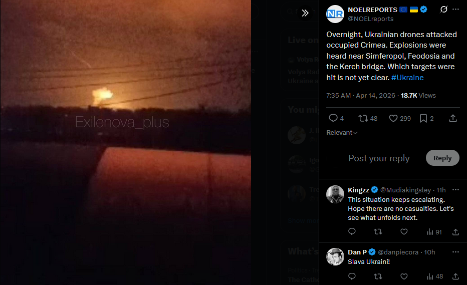 Overnight, Ukrainian drones attacked occupied Crimea. Explosions were heard near Simferopol, Feodosia and the Kerch bridge. Which targets were hit is not yet clear. #Ukrainehttps://x.com/NOELreports/status/2043941159584530760?s=20>14th