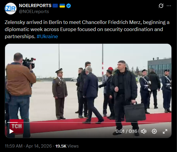 Zelensky arrived in Berlin to meet Chancellor Friedrich Merz, beginning a diplomatic week across Europe focused on security coordination and partnerships. #Ukrainehttps://x.com/NOELreports/status/2044007508679819417?s=20>14thhttps://files.catbox.moe/24waot.mp4