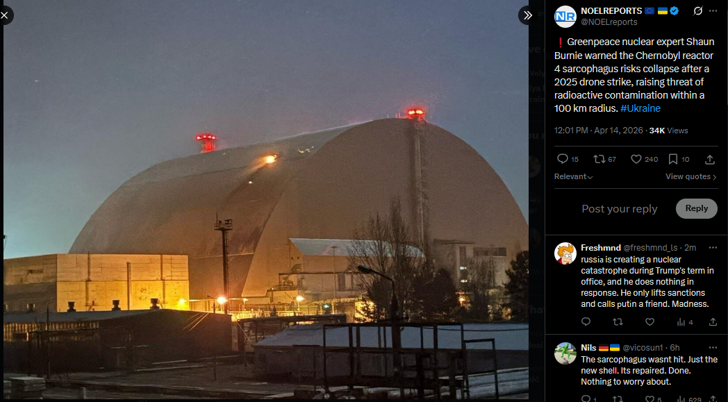 Greenpeace nuclear expert Shaun Burnie warned the Chernobyl reactor 4 sarcophagus risks collapse after a 2025 drone strike, raising threat of radioactive contamination within a 100 km radius. #Ukrainehttps://x.com/NOELreports/status/2044008252862591041?s=20>14h