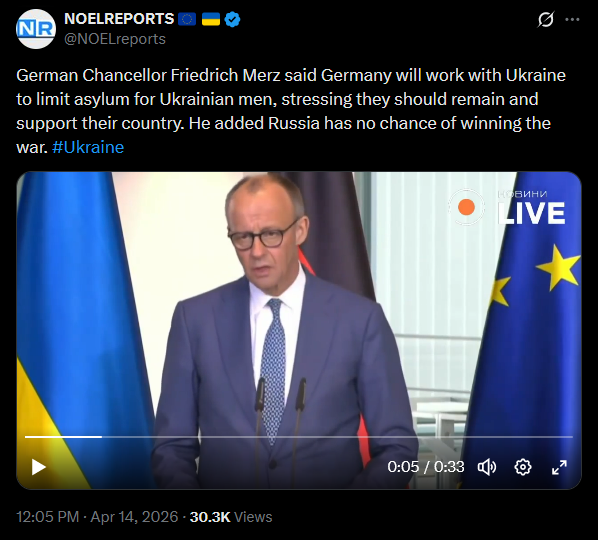 German Chancellor Friedrich Merz said Germany will work with Ukraine to limit asylum for Ukrainian men, stressing they should remain and support their country. He added Russia has no chance of winning the war. #Ukrainehttps://x.com/NOELreports/status/2044009090041401707?s=20>14th