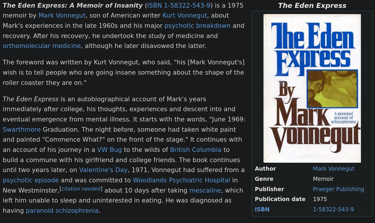 >>533292152>This book might have the answers you want.another good schizo memoir is Mark Vonnegut 'Eden Express', he had a fullon break after weed and recounts what it was like(his megavitamin cure is now considered bullshit tho)https://en.wikipedia.org/wiki/The_Eden_Express