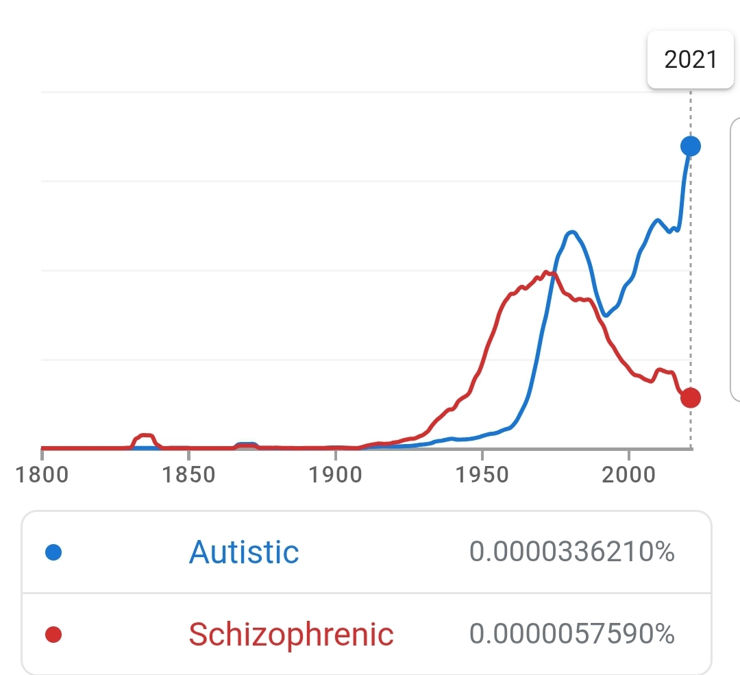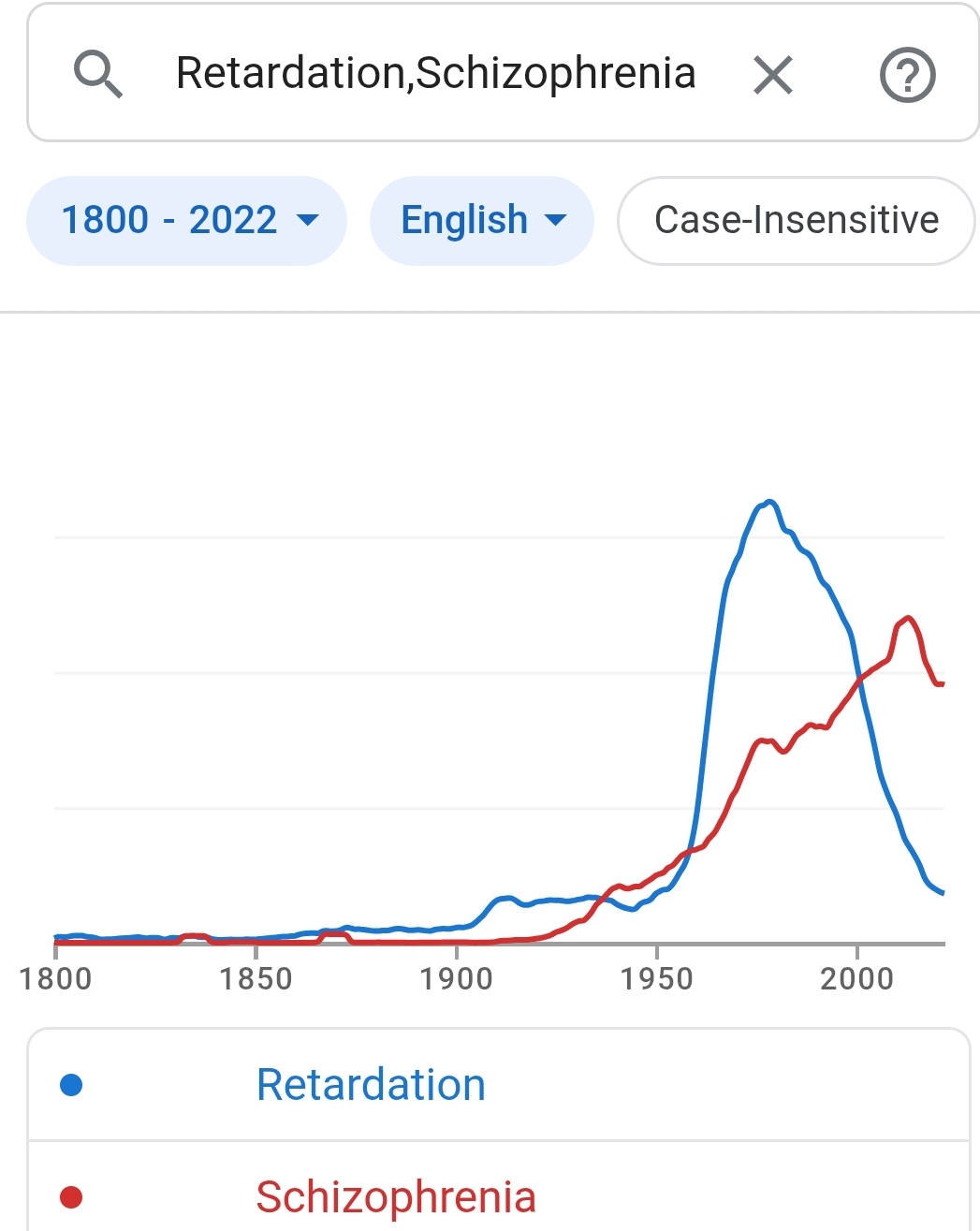 https://books.google.com/ngrams/graph?content=Retardation%2CSchizophrenia&year_start=1800&year_end=2022&corpus=en&smoothing=3