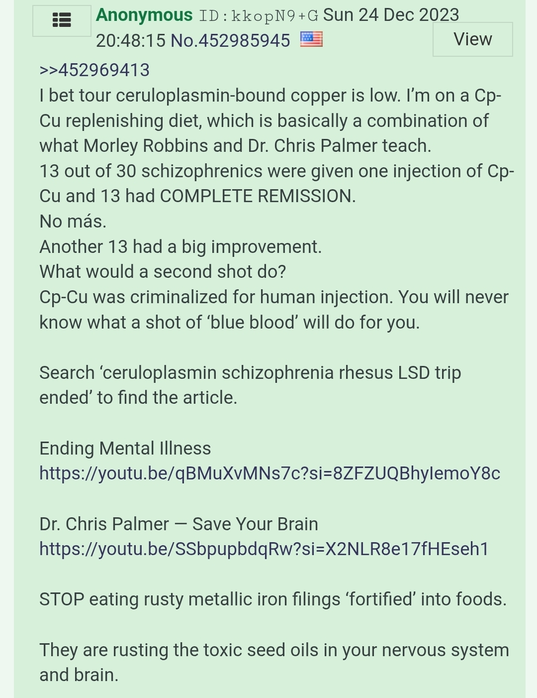 >>533296714Ceruplasmin bound copper allegedly has cured schizophrenia too