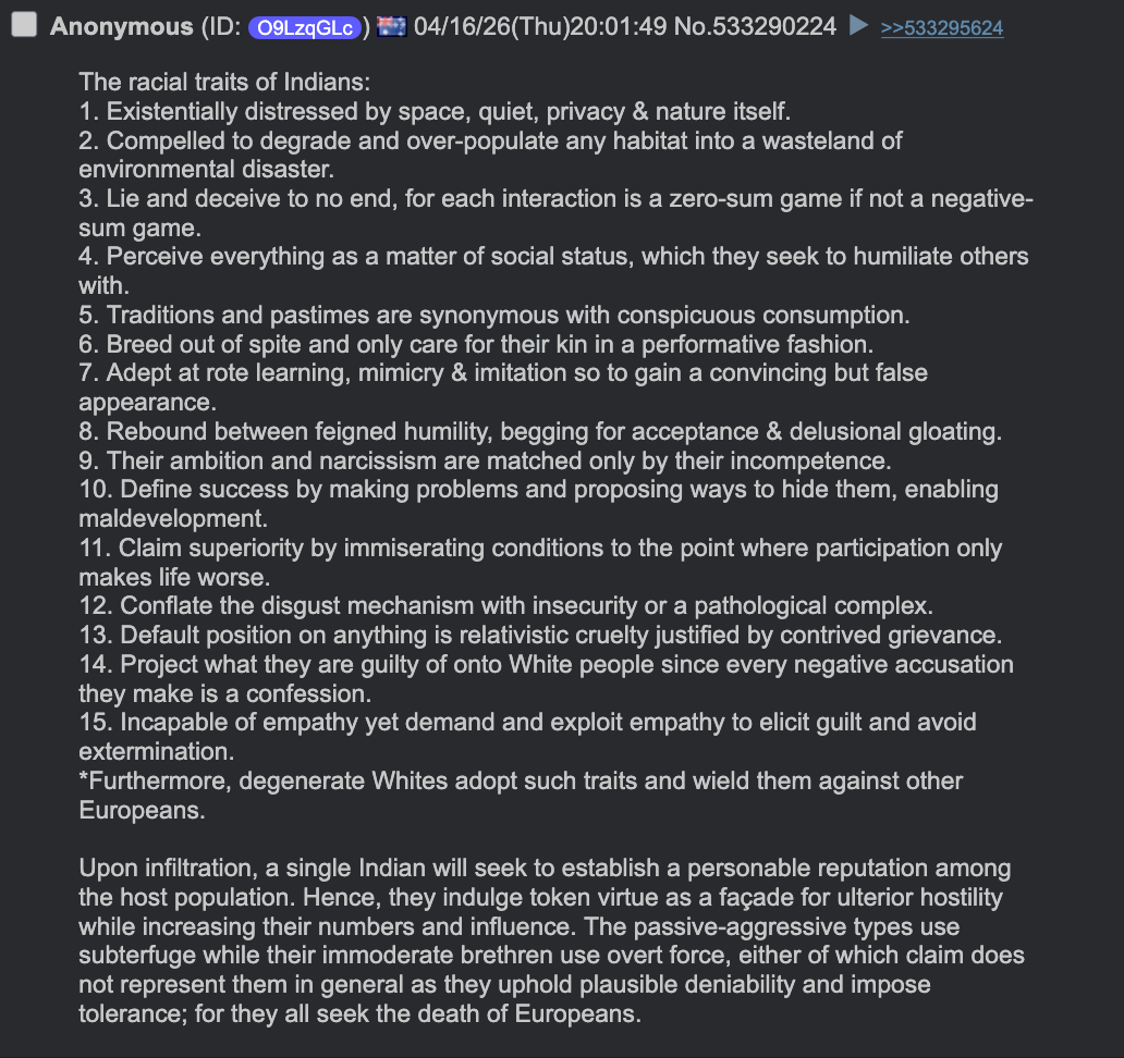 The racial traits of Indians:1. Existentially distressed by space, quiet, privacy & nature itself.2. Compelled to degrade and over-populate any habitat into a wasteland of environmental disaster.3. Lie and deceive to no end, for each interaction is a zero-sum game if not a negative-sum game.4. Perceive everything as a matter of social status, which they seek to humiliate others with.5. Traditions and pastimes are synonymous with conspicuous consumption.6. Breed out of spite and only care for their kin in a performative fashion.7. Adept at rote learning, mimicry & imitation so to gain a convincing but false appearance.8. Rebound between feigned humility, begging for acceptance & delusional gloating.9. Their ambition and narcissism are matched only by their incompetence.10. Define success by making problems and proposing ways to hide them, enabling maldevelopment.11. Claim superiority by immiserating conditions to the point where participation only makes life worse.12. Conflate the disgust mechanism with insecurity or a pathological complex.13. Default position on anything is relativistic cruelty justified by contrived grievance.14. Project what they are guilty of onto White people since every negative accusation they make is a confession.15. Incapable of empathy yet demand and exploit empathy to elicit guilt and avoid extermination.*Furthermore, degenerate Whites adopt such traits and wield them against other Europeans.Upon infiltration, a single Indian will seek to establish a personable reputation among the host population. Hence, they indulge token virtue as a façade for ulterior hostility while increasing their numbers and influence. The passive-aggressive types use subterfuge while their immoderate brethren use overt force, either of which claim does not represent them in general as they uphold plausible deniability and impose tolerance; for they all seek the death of Europeans.