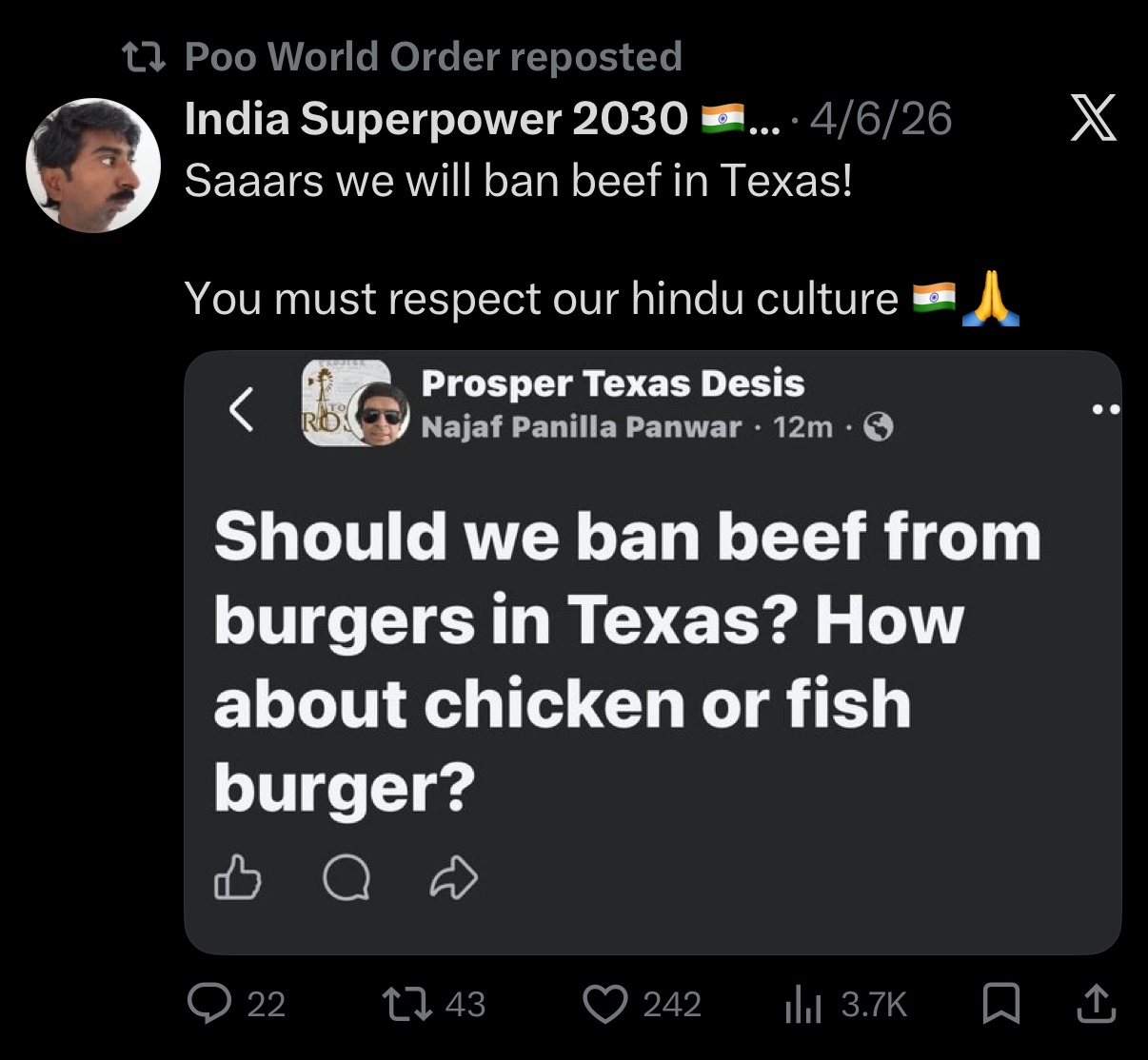 For accelerationist purposes, I absolutely wanna see Indians try banning beef in Texas.