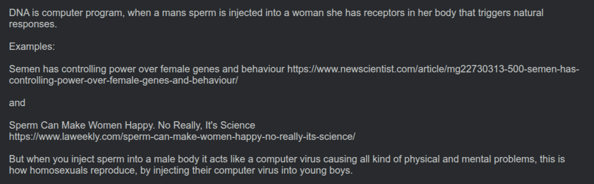 DNA is computer program, when a mans sperm is injected into a woman she has receptors in her body that triggers natural responses.Examples:Semen has controlling power over female genes and behaviour https://www.newscientist.com/article/mg22730313-500-semen-has-controlling-power-over-female-genes-and-behaviour/andSperm Can Make Women Happy. No Really, It's Sciencehttps://www.laweekly.com/sperm-can-make-women-happy-no-really-its-science/But when you inject sperm into a male body it acts like a computer virus causing all kind of physical and mental problems, this is how homosexuals reproduce, by injecting their computer virus into young boys.
