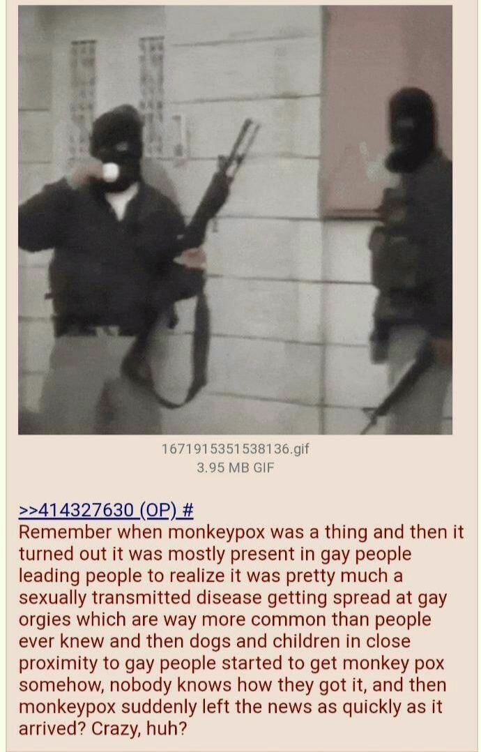 >>533300994Remember when they tried to hype monkey pox into the next kung flu but then it turned out it only infected fags, pets owned by fags and children of fags? It died down right fucking fast after that.Good times.