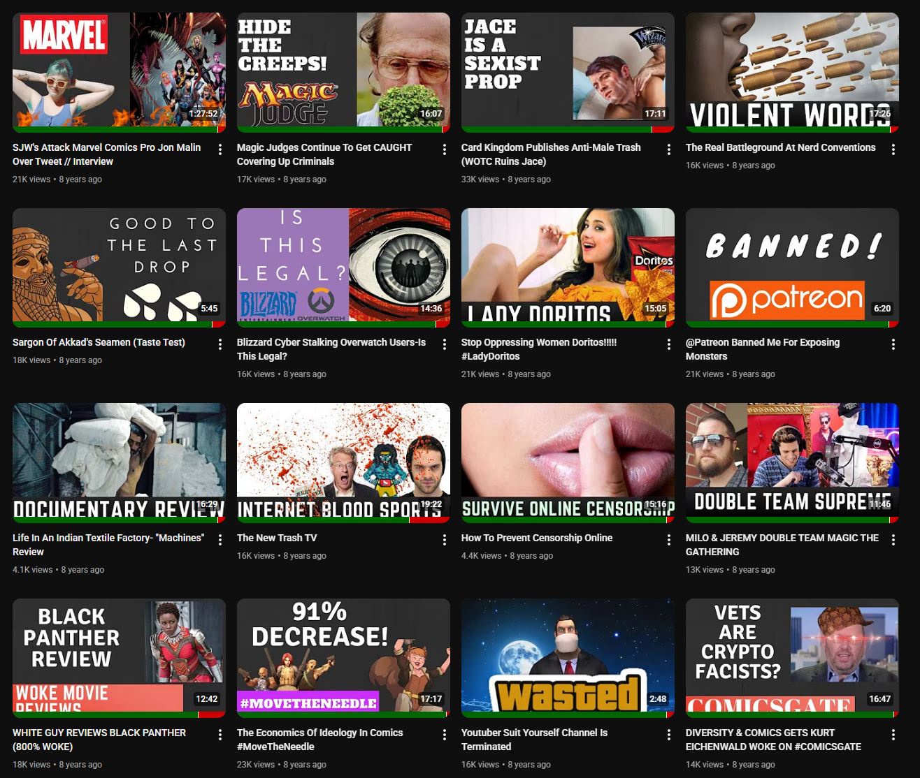 >>533318873>emerged during the gamergate eraBut he didn't emerge during gamergate era, he emerged couple of years after, when SJW's invaded his MTG hobby. Which made sense for him to go on a tirade>picThat's his first videos, he started producing, did he pioneer this thumbnail slop? His second oldest page goes balls in on that.