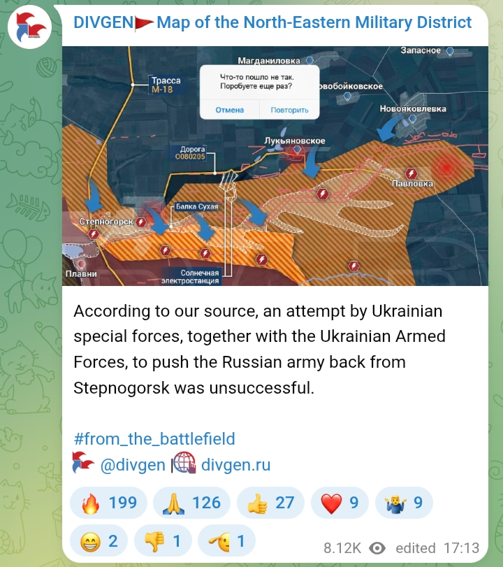 >A counteroffensive attempt by Ukrainian special forces, together with the Ukrainian Armed Forces, to push the Russian army back from Stepnogorsk was unsuccessful.