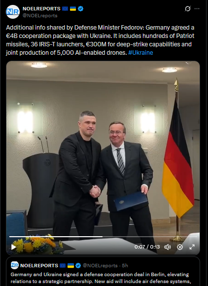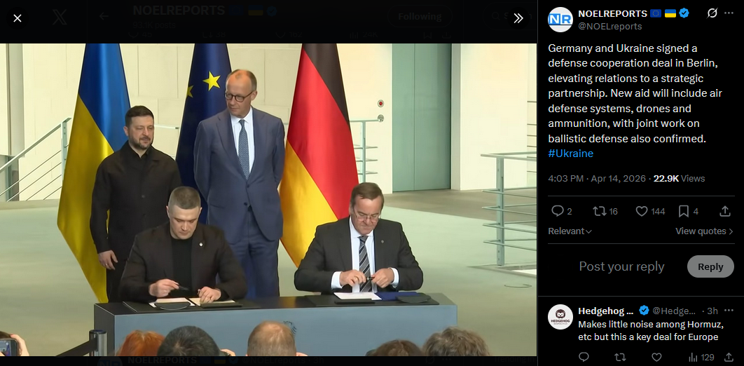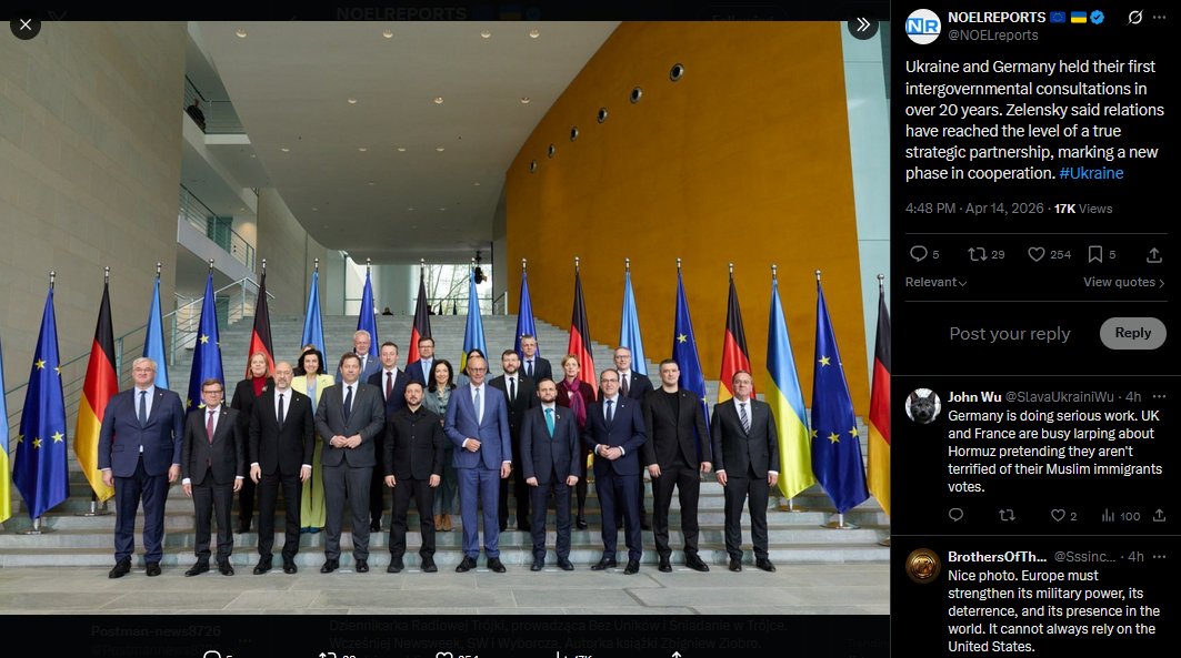 Ukraine and Germany held their first intergovernmental consultations in over 20 years. Zelensky said relations have reached the level of a true strategic partnership, marking a new phase in cooperation. #Ukrainehttps://x.com/NOELreports/status/2044080408191488141?s=20>14th