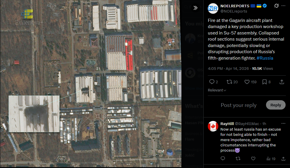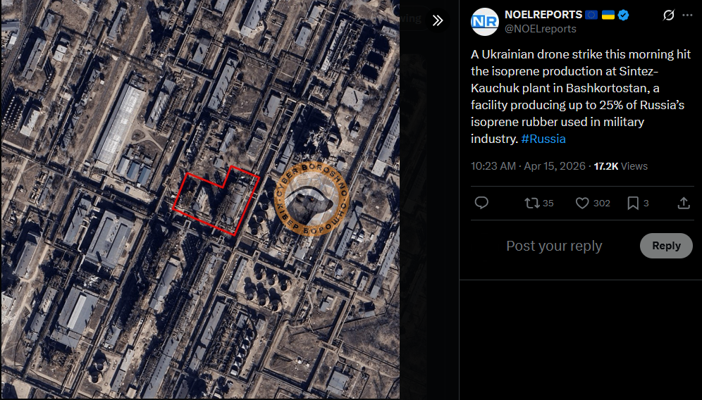 A Ukrainian drone strike this morning hit the isoprene production at Sintez-Kauchuk plant in Bashkortostan, a facility producing up to 25% of Russia’s isoprene rubber used in military industry. #Russiahttps://x.com/NOELreports/status/2044345799870476746?s=20>15thhttps://files.catbox.moe/91gkmd.jpg