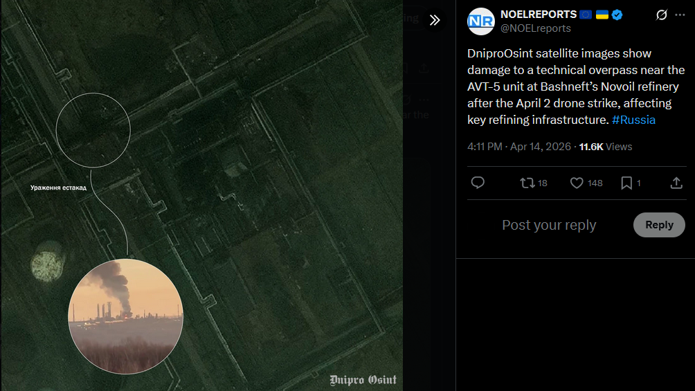 DniproOsint satellite images show damage to a technical overpass near the AVT-5 unit at Bashneft’s Novoil refinery after the April 2 drone strike, affecting key refining infrastructure. #Russiahttps://x.com/NOELreports/status/2044071147969425828?s=20>14thhttps://files.catbox.moe/iilalo.jpg