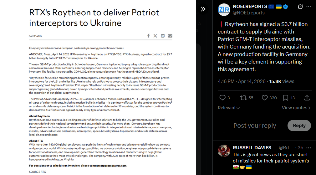 Raytheon has signed a $3.7 billion contract to supply Ukraine with Patriot GEM-T interceptor missiles, with Germany funding the acquisition. A new production facility in Germany will be a key element in supporting this agreement.https://x.com/NOELreports/status/2044072343580868749?s=20>14thhttps://files.catbox.moe/yatrzh.png