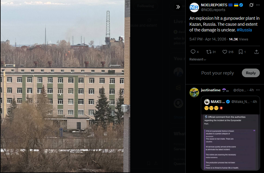 An explosion hit a gunpowder plant in Kazan, Russia. The cause and extent of the damage is unclear. #Russiahttps://x.com/NOELreports/status/2044095269474603336?s=20>14th