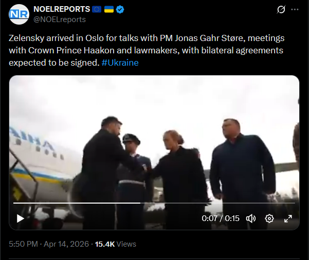 Zelensky arrived in Oslo for talks with PM Jonas Gahr Støre, meetings with Crown Prince Haakon and lawmakers, with bilateral agreements expected to be signed. #Ukrainehttps://x.com/NOELreports/status/2044095899727532531?s=20>14thhttps://files.catbox.moe/aj0pet.mp4